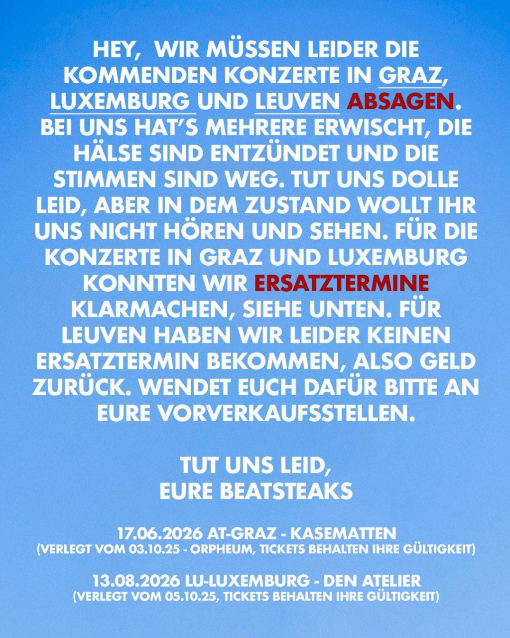 Doppelmeldung – man könnte fast sagen, jetzt geht es Schlag auf Schlag: Hamburg und Münster melden AUSVERKAUFT! Bei den restlichen Terminen nicht trödeln, Tickets gibt’s hier » beatsteaks.com/live/